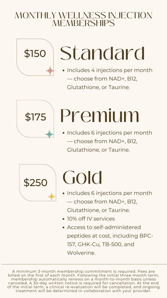 NAD+, Glutathione, Taurine, B12 Injections/Infusions (See Membership Plans Below)